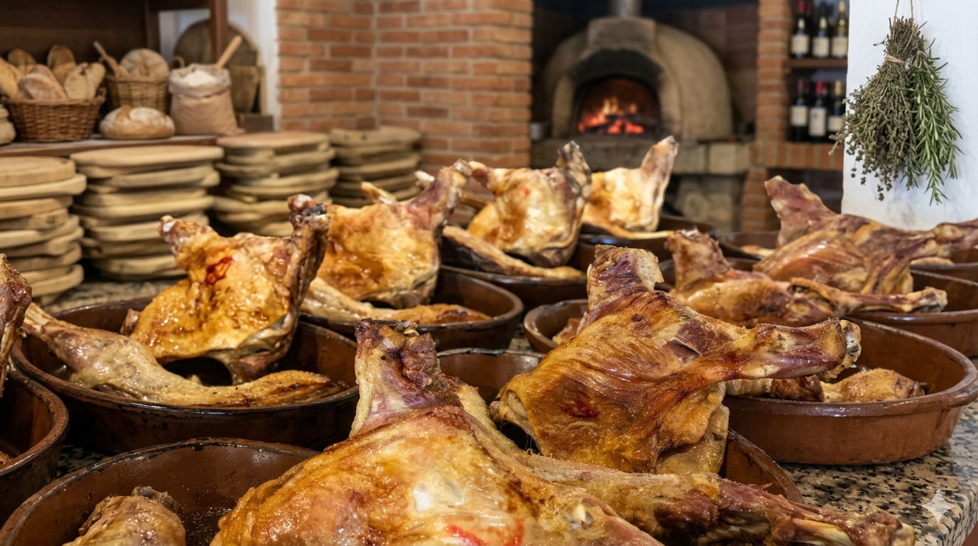 El espacio conserva la arquitectura y decoración típicamente castellanas, con madera vista, suelos de barro y una cuidada ambientación rústica. Ofrecemos platos tradicionales de la zona, destacando el cordero segoviano asado, uno de los emblemas gastronómicos de la casa.